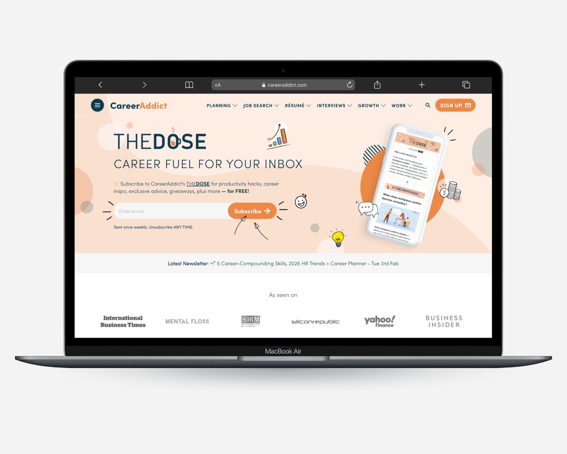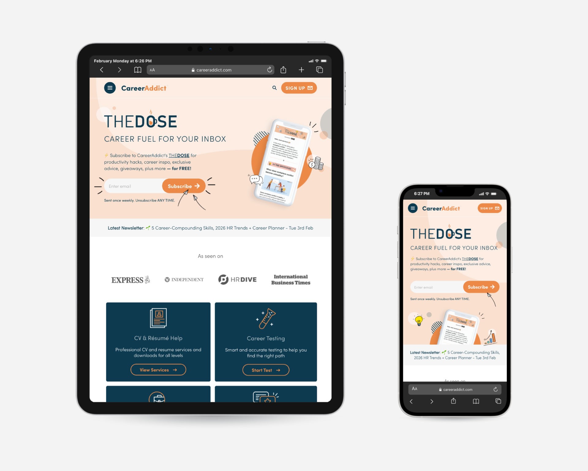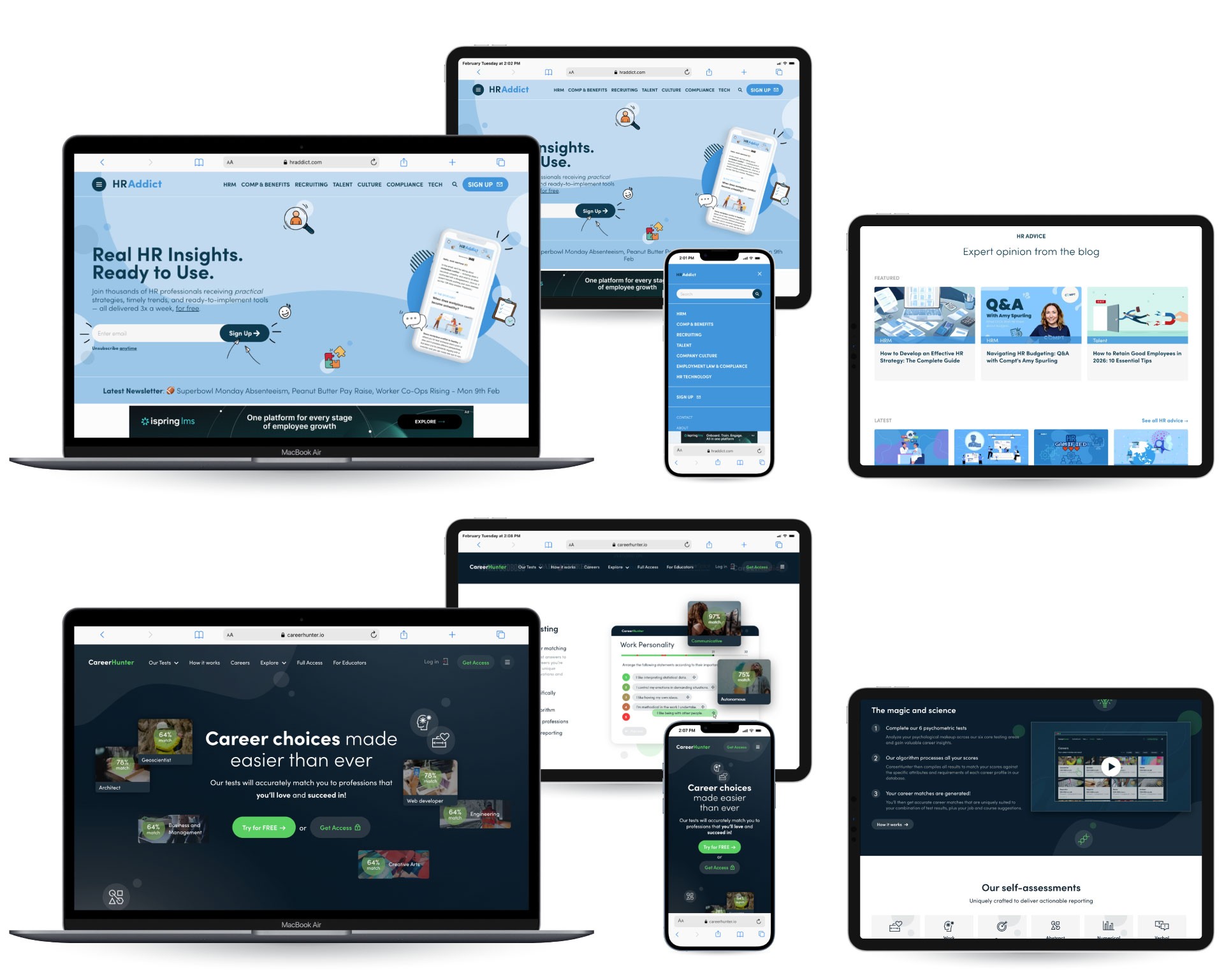 The visual redesign introduces a clean yet dynamic interface, balancing professional credibility with approachability. A refined colour palette, consistent typographic hierarchy, and modular layouts were used to improve readability while allowing visual flexibility across different content formats. Special attention was given to hero sections and promotional areas, such as newsletter sign-ups and product highlights, combining illustration, UI elements, and typography to guide user attention without overwhelming the interface. PLATFORM INTEGRATION CareerAddict was designed as a hub platform, connecting users to related services within its ecosystem. The redesign visually integrates HR Addict and CareerHunter through mockups and interface references, reinforcing brand cohesion while clearly distinguishing each platform’s role. This approach strengthens CareerAddict’s position as the central entry point for career development resources.