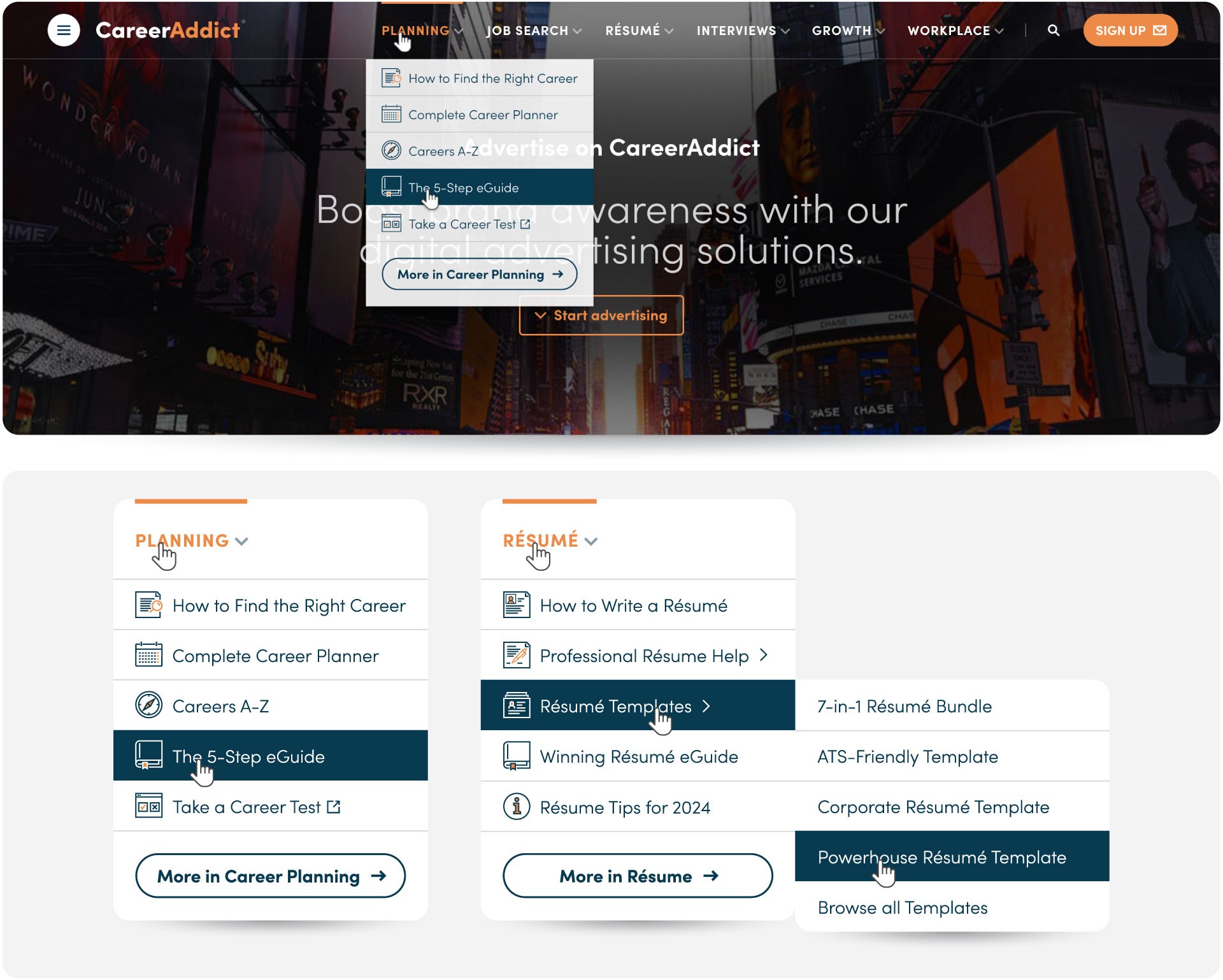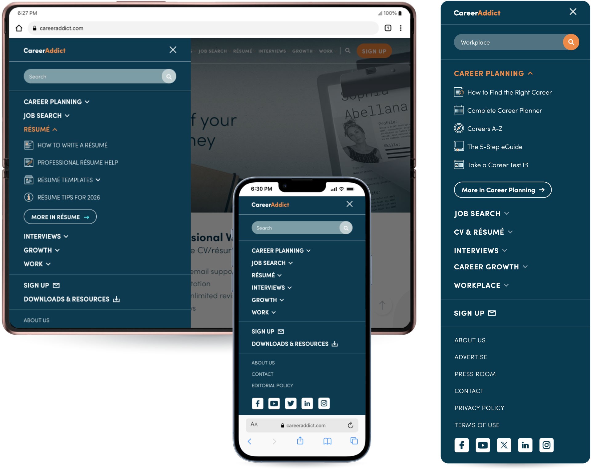 NAVIGATION Given the breadth of CareerAddict’s content, navigation was a central design challenge. The navigation system was redesigned to clearly structure key categories such as career planning, résumés, interviews, growth, and workplace topics. Dropdowns and menus were carefully organised to support quick scanning and intuitive access, reducing cognitive load for users navigating large content volumes. Navigation concepts were explored and refined through desktop and mobile mockups, ensuring consistency and usability across devices. RESPONSIVE DESIGN The redesign was approached with a responsive-first mindset, adapting layouts seamlessly across desktop, tablet, and mobile screens. Navigation, content blocks, and call-to-action elements were restructured for smaller viewports, ensuring accessibility and clarity without sacrificing functionality. This ensures a cohesive experience regardless of device, while preserving the platform’s visual identity.