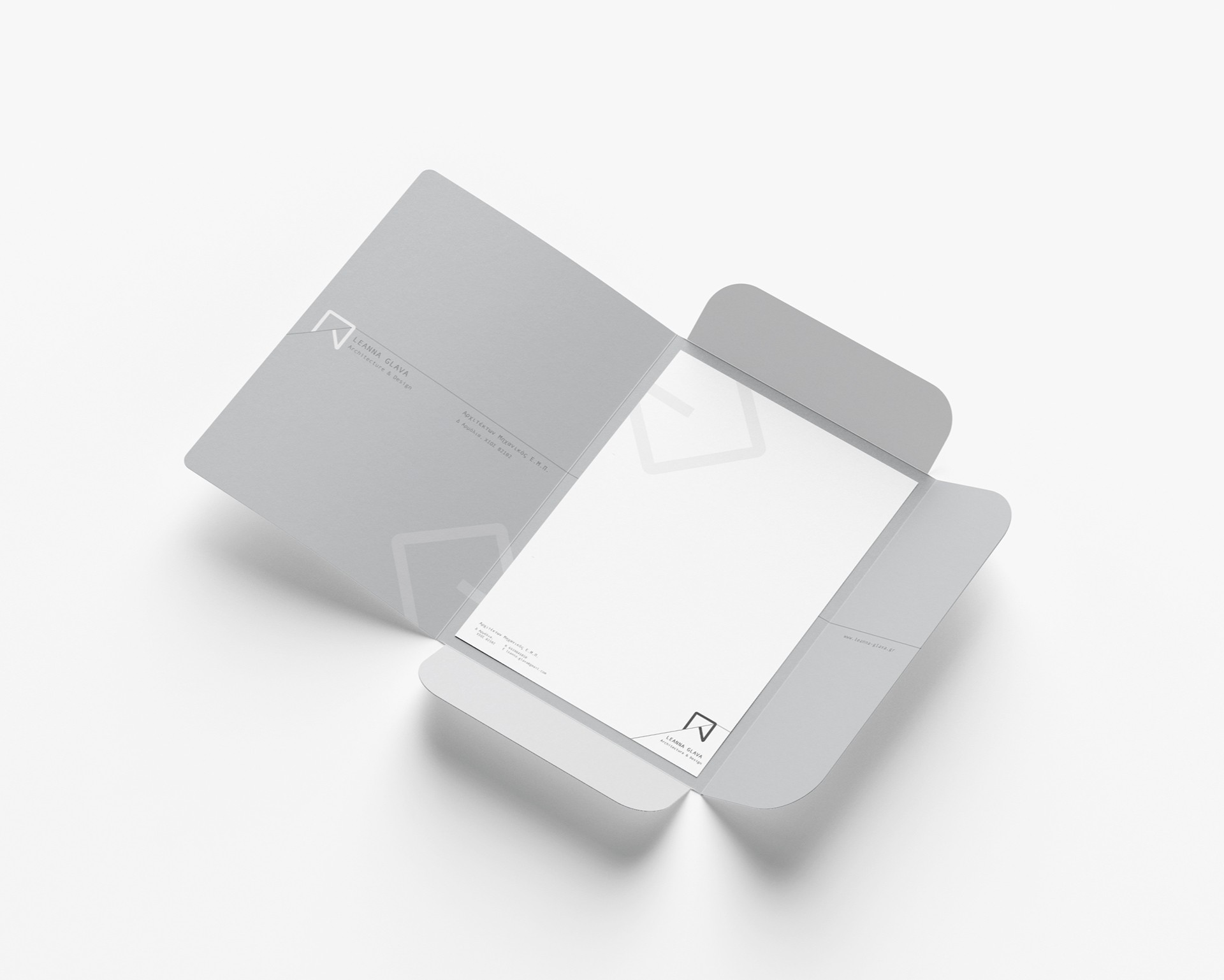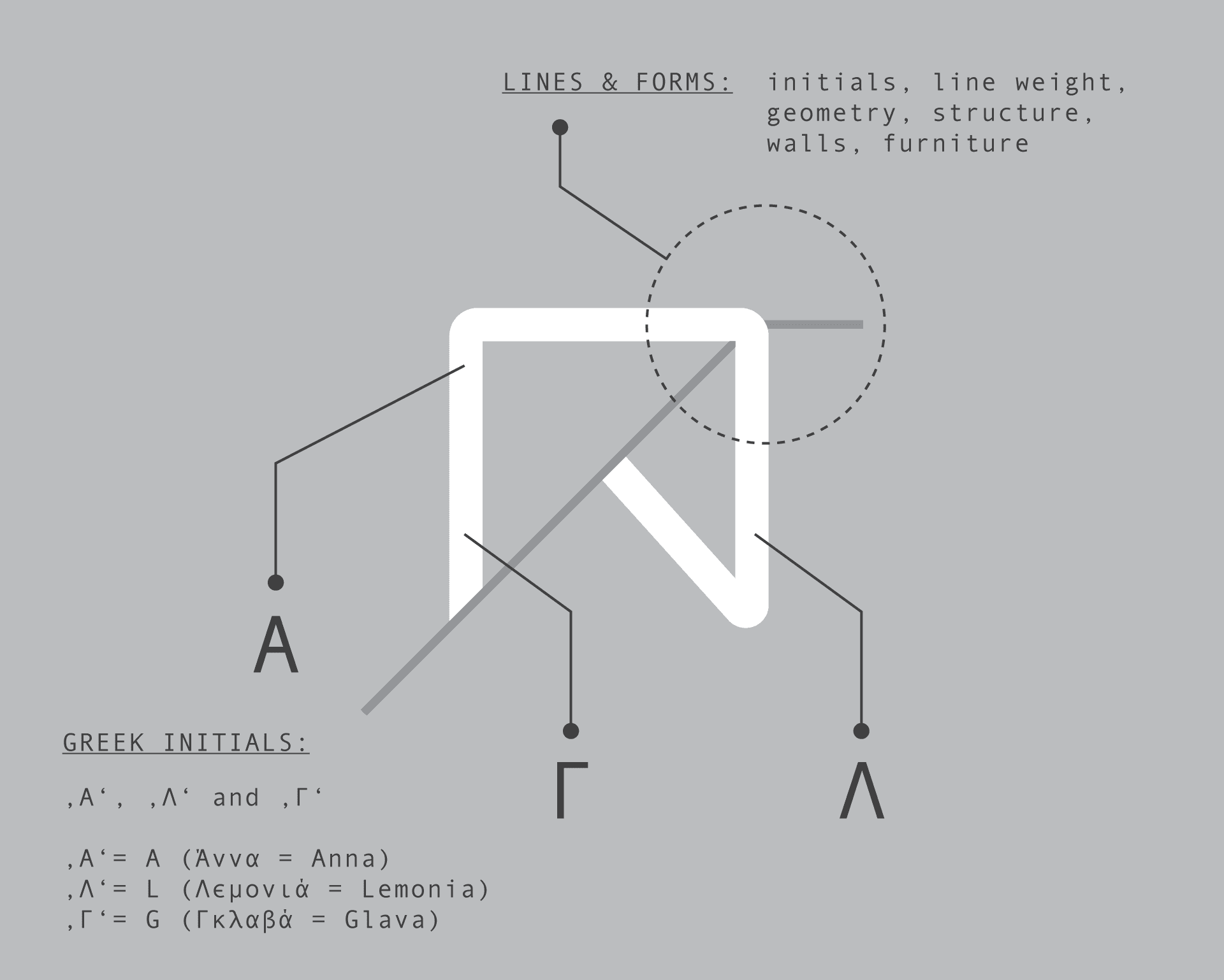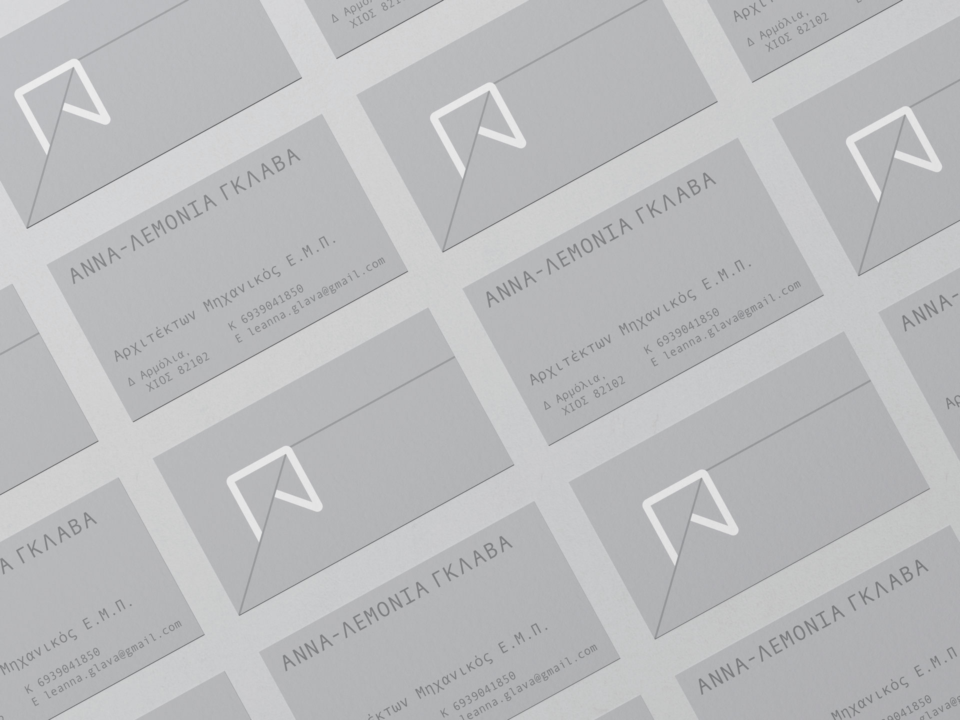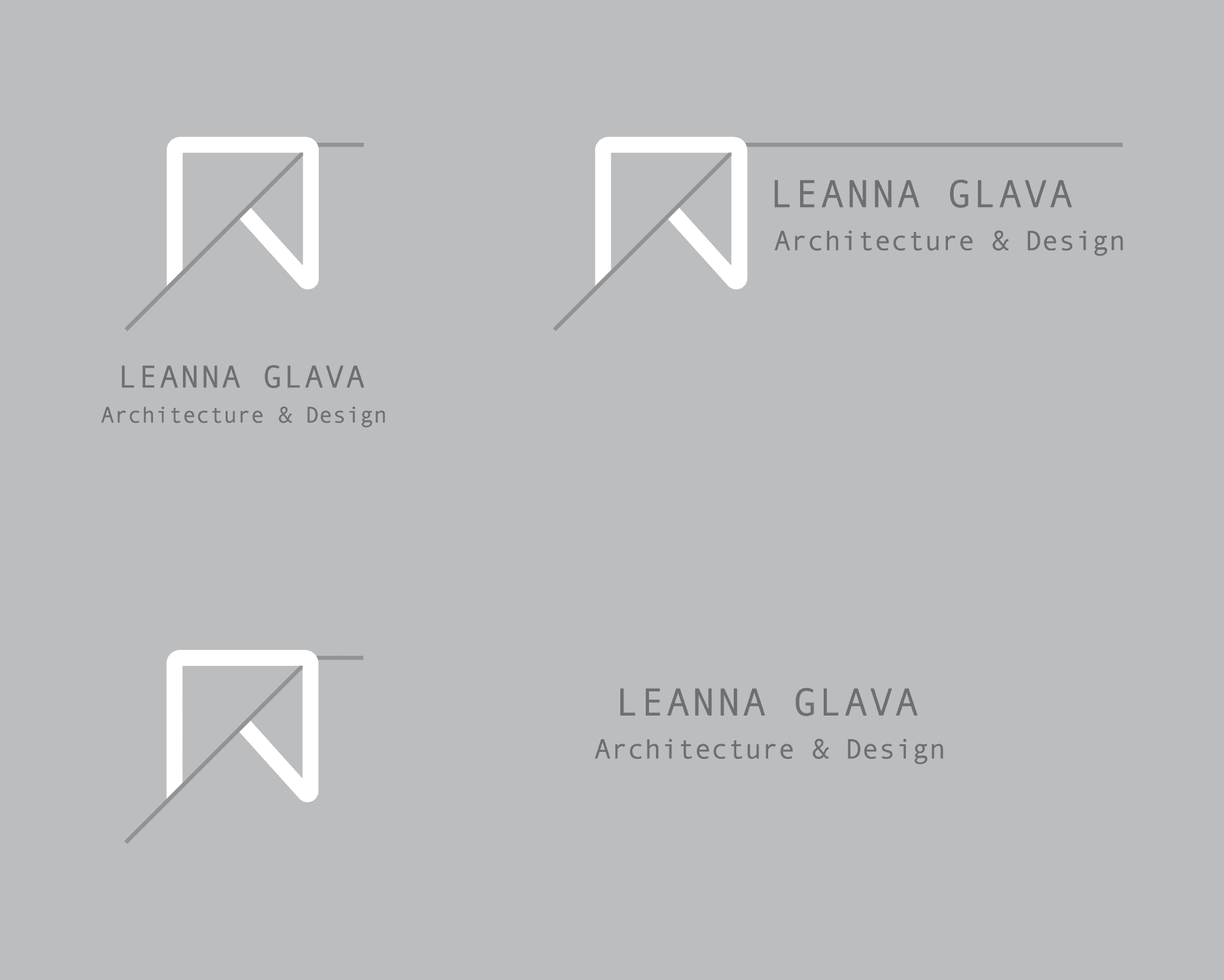The logo is derived from the Greek initials Γ (Gamma), Λ (Lambda), and Α (Alpha), referencing the name Leanna Glavas (Leanna from Anna and Lemonia, Glavas as the surname). The letterforms are constructed through the interaction of solid and fine lines, following the visual conventions of architectural drawings. Thick lines represent primary structure and walls, while thin lines indicate secondary elements, reference axes, or spatial guidance. This contrast establishes a clear structural hierarchy within the mark itself. The result is a geometric symbol rooted in architectural notation — precise and rational in its construction, yet intuitive and visually balanced in its final form. The thin lines are intentionally not treated as closed shapes. Instead, they are designed to extend beyond the core mark, allowing the identity to expand into layouts, margins, and applications. This approach reflects the architectural process, where lines begin as guides and reference systems before evolving into defined structure and space. What starts as a drawing continues into a spatial idea. In applications such as the business card, these fine lines extend into the surrounding format, creating a subtle connection between logo and composition. Rather than containing the mark within a fixed boundary, the system allows it to interact with its environment. The logo therefore operates not as a static symbol, but as a flexible graphic framework that adapts while maintaining structural coherence.