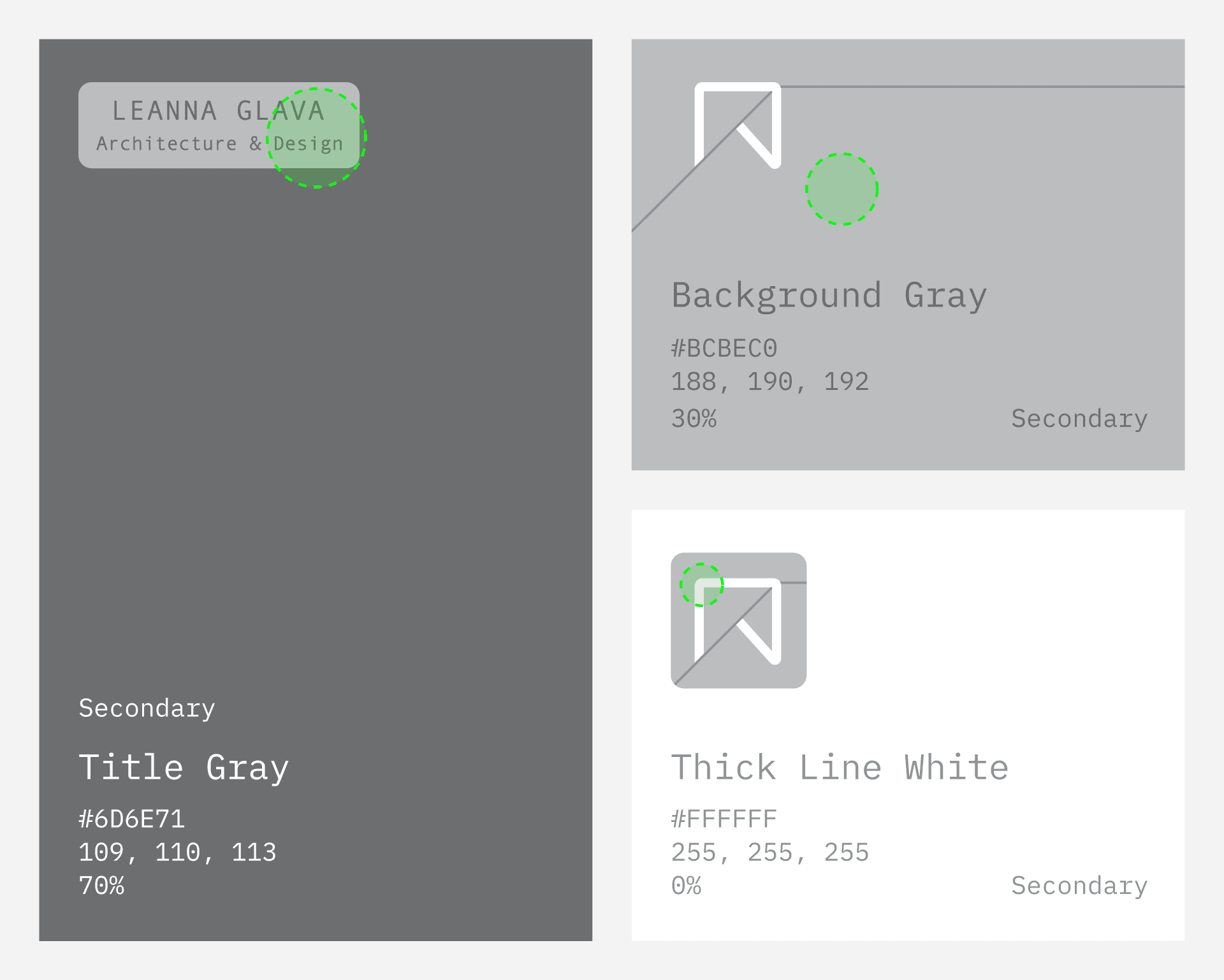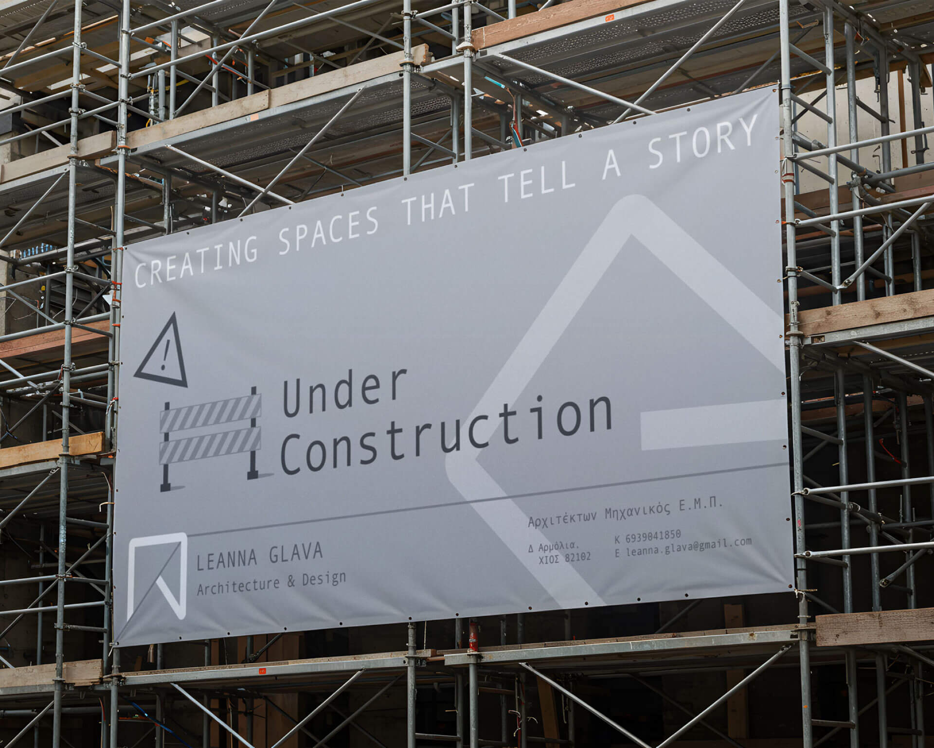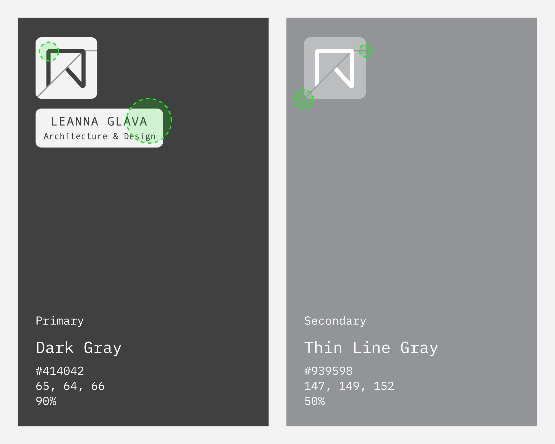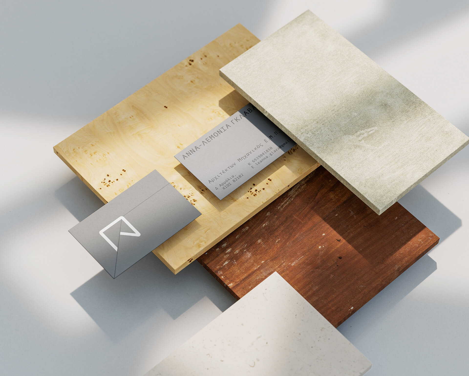 The logo is derived from the Greek initials Γ (Gamma), Λ (Lambda), and Α (Alpha), referencing the name Leanna Glavas (Leanna from Anna and Lemonia, Glavas as the surname). The letterforms are constructed through the interaction of solid and fine lines, following the visual conventions of architectural drawings. Thick lines represent primary structure and walls, while thin lines indicate secondary elements, reference axes, or spatial guidance. This contrast establishes a clear structural hierarchy within the mark itself. The result is a geometric symbol rooted in architectural notation — precise and rational in its construction, yet intuitive and visually balanced in its final form. The thin lines are intentionally not treated as closed shapes. Instead, they are designed to extend beyond the core mark, allowing the identity to expand into layouts, margins, and applications. This approach reflects the architectural process, where lines begin as guides and reference systems before evolving into defined structure and space. What starts as a drawing continues into a spatial idea. In applications such as the business card, these fine lines extend into the surrounding format, creating a subtle connection between logo and composition. Rather than containing the mark within a fixed boundary, the system allows it to interact with its environment. The logo therefore operates not as a static symbol, but as a flexible graphic framework that adapts while maintaining structural coherence.
