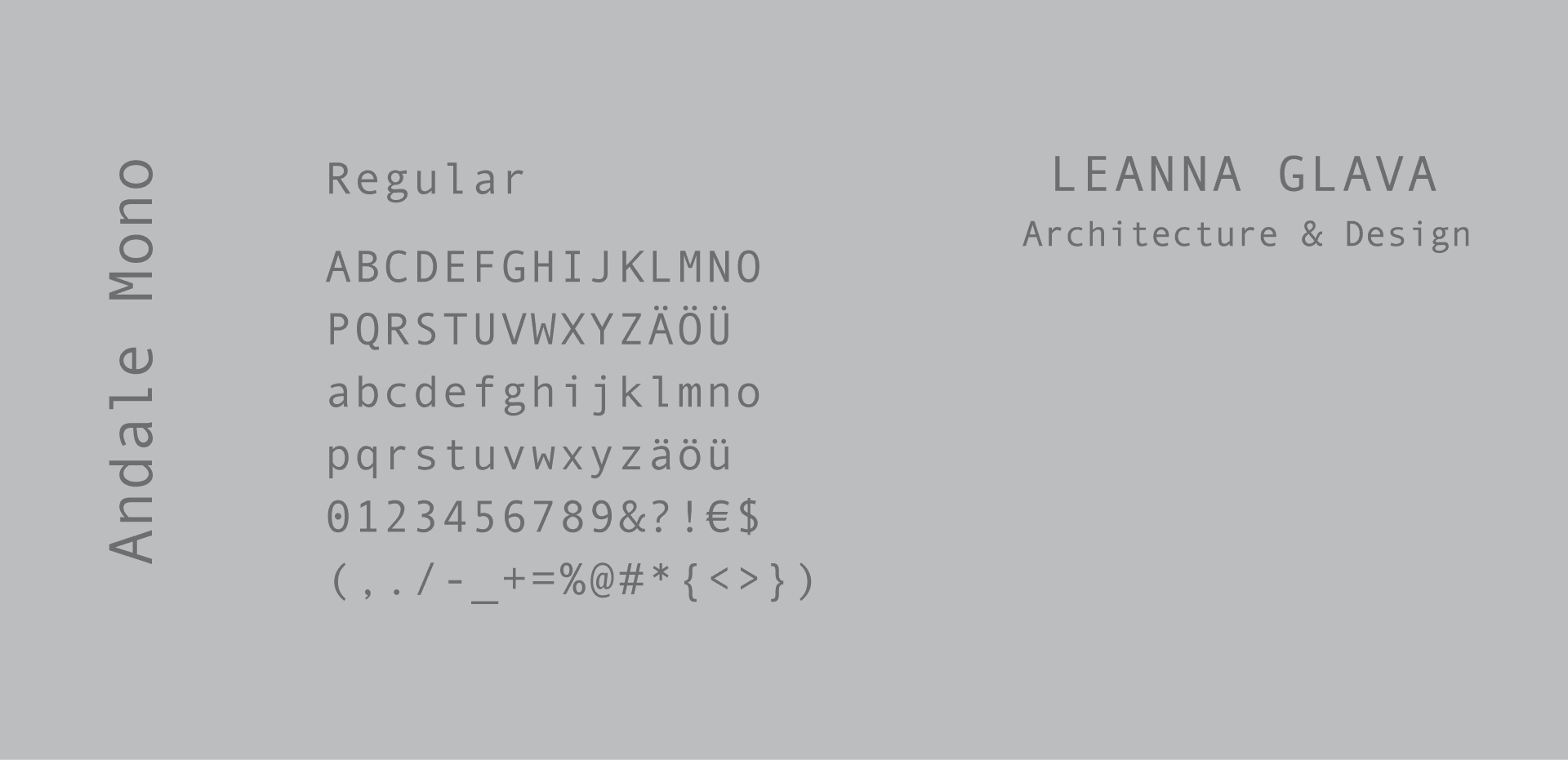 Andale Mono (Regular) was chosen as the primary typeface for the logo title and business card. As a monospaced font, it conveys precision, clarity, and technical rigor, qualities closely associated with architectural drawings and drafting notation. The uniform character width creates a calm, measured rhythm and reinforces the conceptual link between architecture, construction logic, and graphic structure. Its restrained, functional character supports legibility while avoiding stylistic excess.